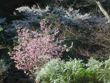 今日の写真も、きのうのムードの続き。光線は、逆光でなく斜光。手前からユキヤナギ、八重桜のようなサクラ、ソメイヨシノの順である。ユキヤナギの花は純白だが、全体としては萌木色、濃い桜色、そしてソメイヨシノが光を反射して白っぽいので、菱餅と同じ色合わせ。ただし順序が違うけれど。