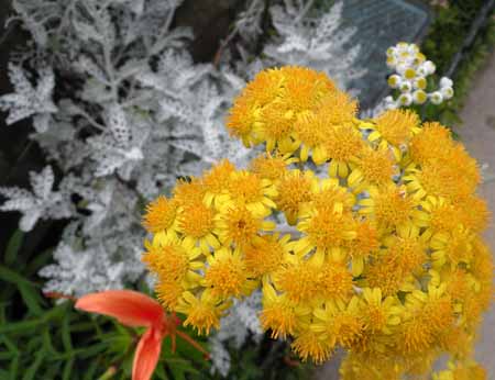 このシロタエギクは、梅雨の始まる頃、鮮やかに黄色い花を着ける。それまでは目立たない存在だったのが、曇天のもと急に生き生きとしてくる。