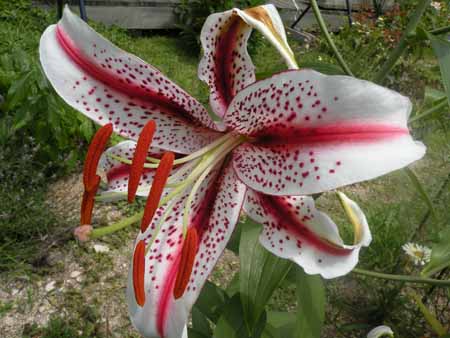 その「紅筋」ヤマユリにそっくりというので、昨秋に球根を購入してみた。それが今、盛んに咲いている。庭の花が少なくなった時季だから、具合が良い。