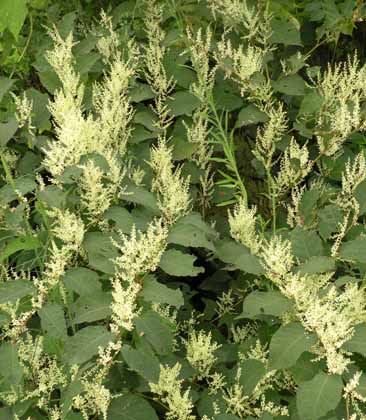 イタドリは枝垂れた枝に従って花穂を立てるので、花がラインに並ぶのが目立つ。