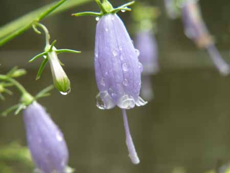 「釣鐘」から突き出た雌しべの先端が閉じているのは、どうやら雨のせいらしい。本来なら、白い開いた先端と穴が見えるのだが、ほとんどの花でそれがない。