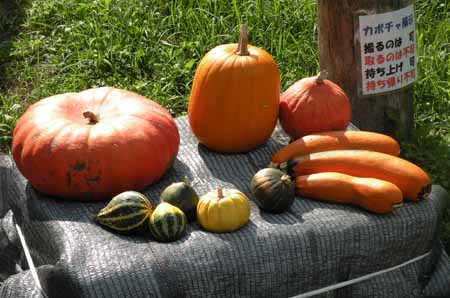 名前は手前左から、オモチャカボチャ(観賞用)、ミニカボチャ・プッチーニ(家庭菜園用)、ミニカボチャ・栗坊?(家庭菜園用)、ズッキーニ・ゴールドトスカ(若い実を収穫)。