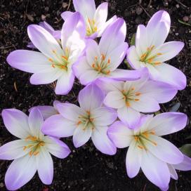 花の名は不明ですが、春には葉だけが出ます。それもいつのまにか消え、秋になると地面からいきなり花が咲きだす面白い花です。今は雨に打たれて地面に伏せてしまいましたが、クロッカスより数倍大きな花です。