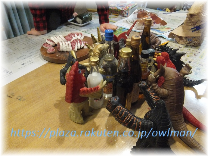 トキがお酒の周りに怪獣が群がってるようにディスプレイ(?)