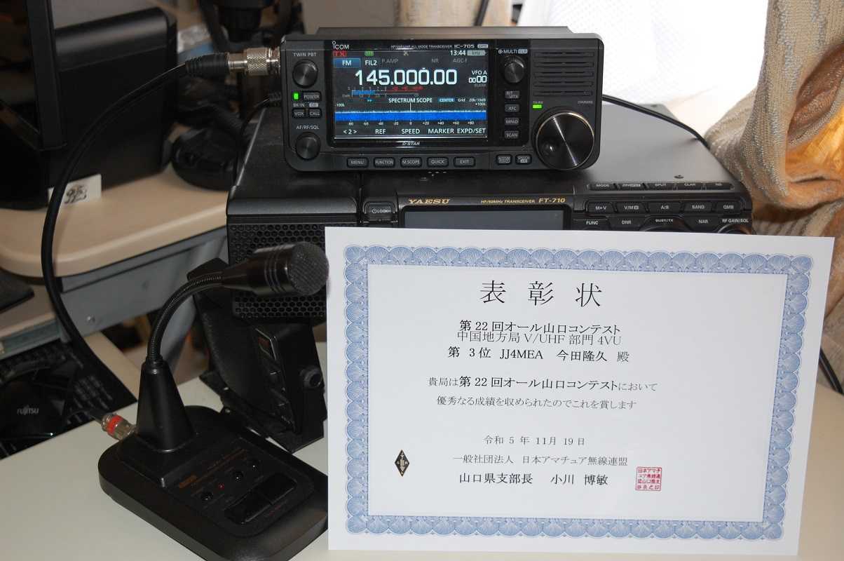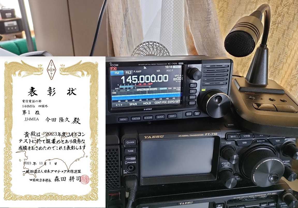 JA5コンテスト四国外部門で運良く入賞出来ました。四国内局と交信すればポイントになります。自宅からIC-705 10WでアンテナはGPでした。スタンドマイクはアドニスを使いました。このコンテストはログ提出が少ないので移動運用すれば入賞出来るコンテストです。最近はコンテストで移動運用はせずいつも自宅からの運用です。IC705は10W FM運用すると本体が直ぐに熱くなるので後ろからファンで冷やしながらの運用でした。