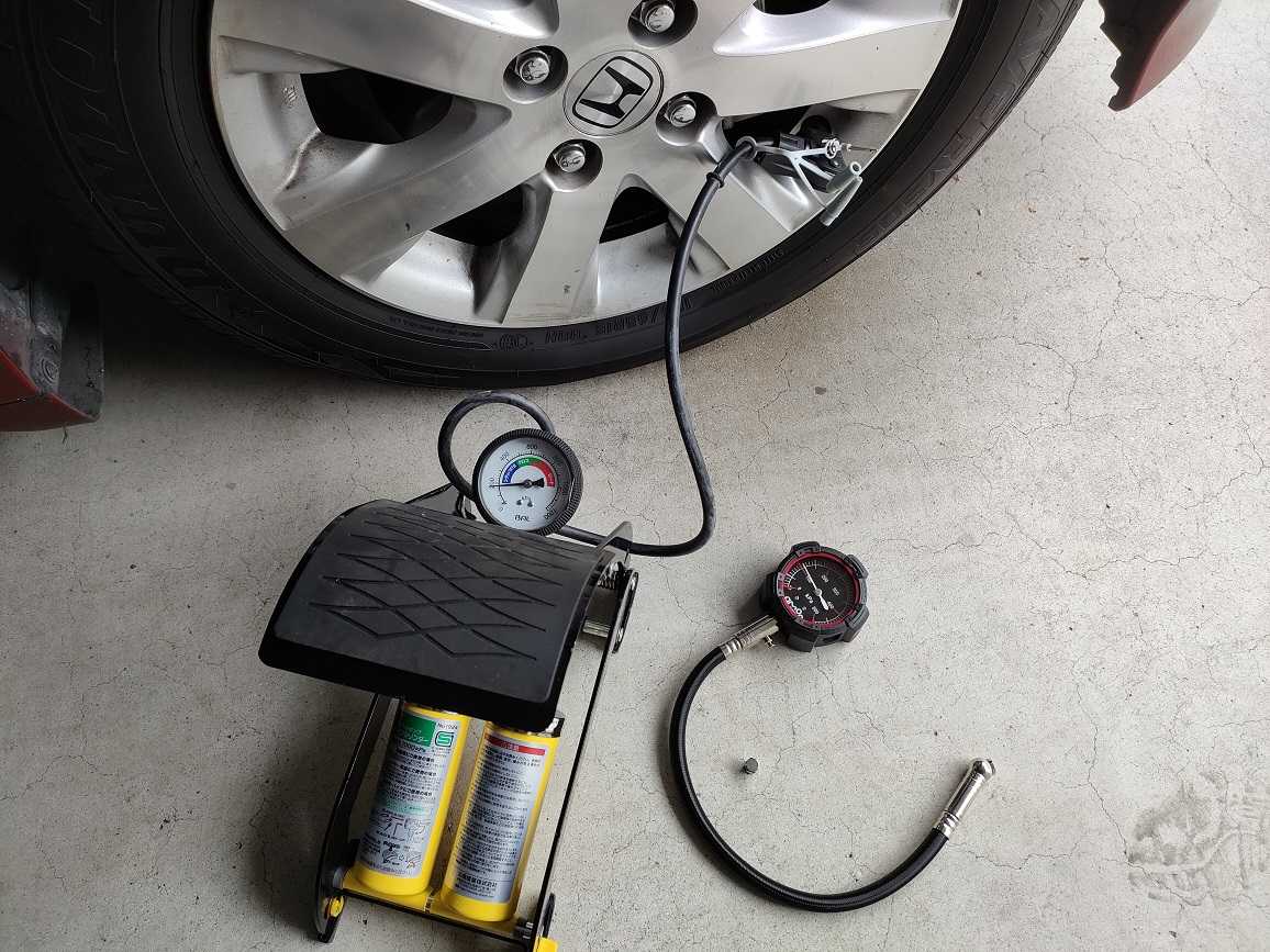 久しぶりに高速道路を走行するので空気圧チェックしました。2ヶ月前に点検で調整して貰ってましたが10kPa減ってました。FREEDは規定値が220kPaですので少しエアを入れ足しました。以前持ってたエアゲージ誤差が出るようになったので、写真下のエアゲージをamazonで購入しましたが、測定時エア漏れも無くお勧め商品です。