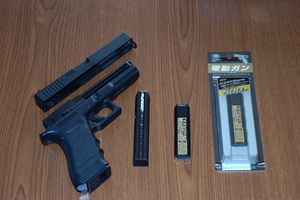 電動GUN用バッテリーも6年でフル充電しても2日で放電してしまい寿命ですので新しくamazonで購入しました。(定価2,400円)この東京マルイ製グロックは電動仕様でガスガンのようにスライドはブローバックで作動せず固定のままですが、セミ&フルオート連射が切換出来て命中精度も高いです。