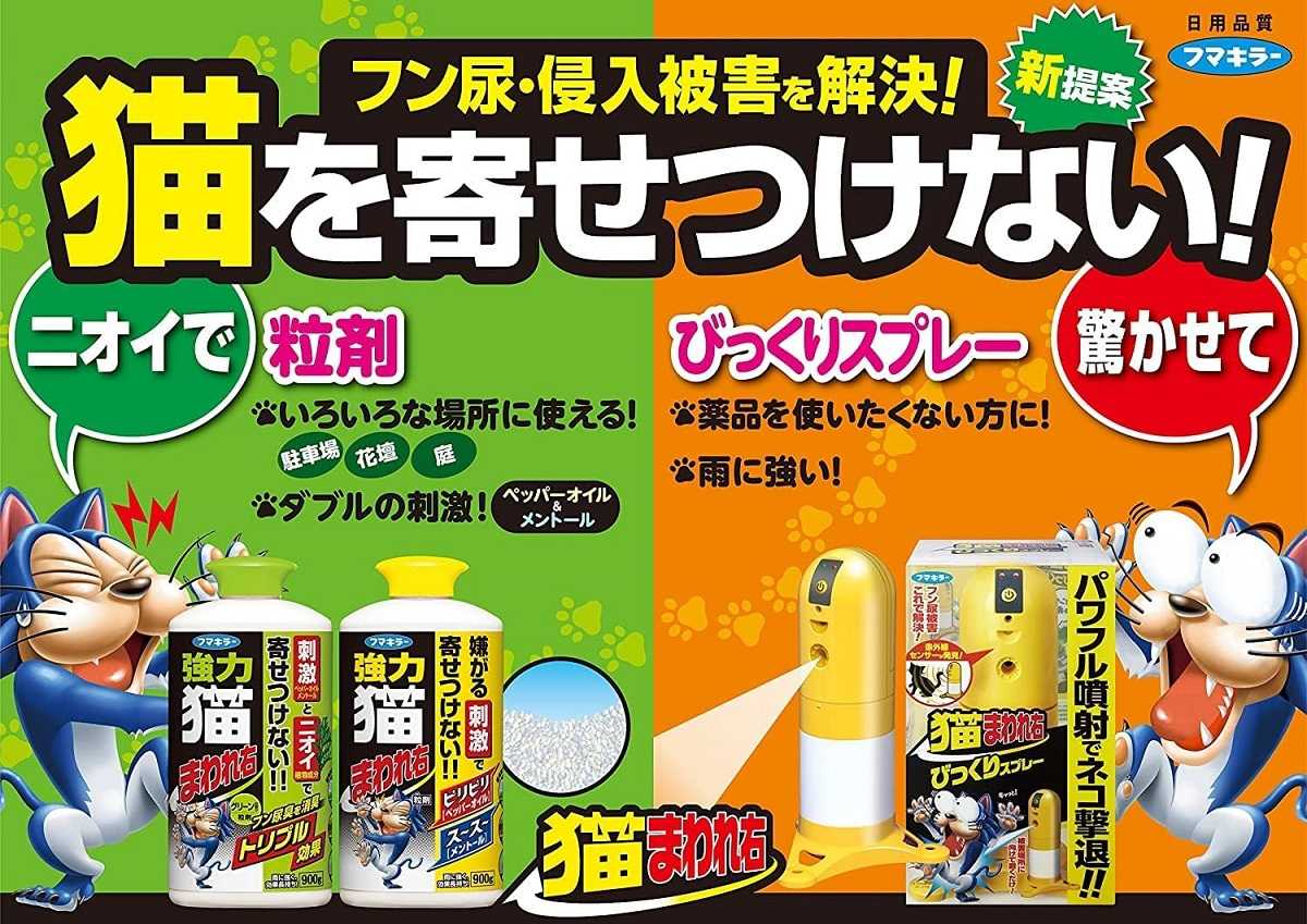 我家の庭に糞尿が絶えず馬鹿猫はどうもここが気に入ったようです。野良猫に餌付けしてる家にお願いしても全く無視。最後は自衛するしなかいと写真上のグッズをamazonに注文。野良猫対策で既に数万円使ってるので年金生活者を苛めてます。野良猫が侵入してる方向に向けて設置(写真下)しましたがセンサー誤作動もあるようです。50回位しか噴射しないので取り換えスプレーは必要です。夕方庭から猫の鳴き声が聞こえたので噴射に吃驚したのでしょう。隣の塀越から侵入が多いので付近に刺激薬を散布しましたが、改善しないようなら隣の塀沿いにボード張り対策も考えてます。