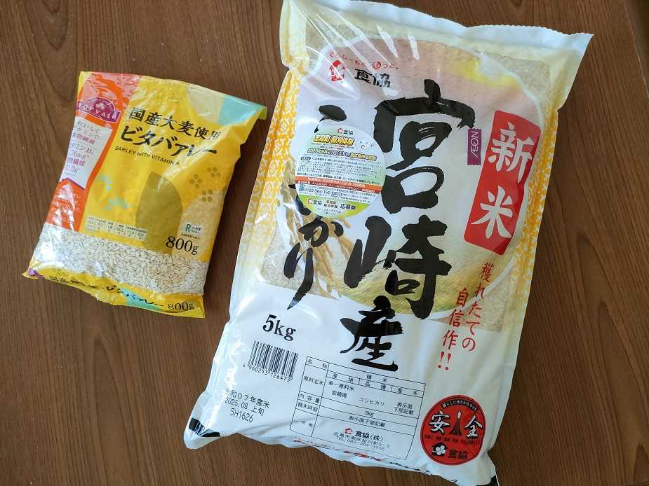 お米は新米を買ってます。皆さん古古米が安いと買い求めてますがそもそも肥料用で安価ですが良い値段で販売してます。癖のある匂いと味の低下がありますので買った事はありません。お米を買う日は5%OFFの日で、食べる際は国産大麦をブレンドしてます。お米の食べ過ぎは血糖値を上げる傾向にあるので1日1合以下で5kg買えば結構あります。