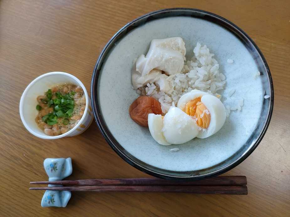 朝食を抜く事は体に悪いので少しでも摂ってます。卵と豆腐、梅干し、納豆は定番です。味噌汁も作ってましたが最近は食が細くなり飲まなくなりましたが夕食のサラダには手作りの酢味噌を作ってます。