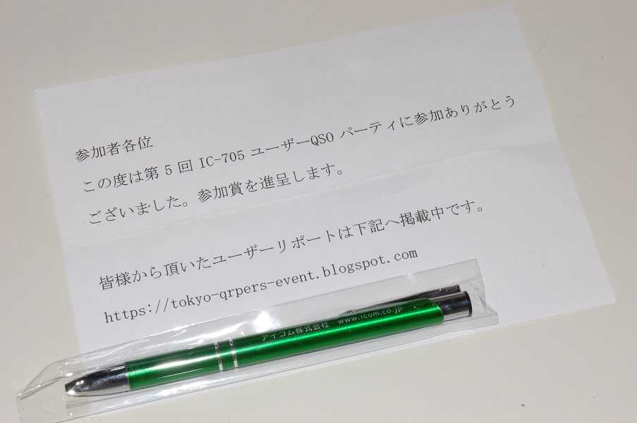 今年のIC-705のQSOパーティ参加賞が届きました。ICOM入りのボールペンでした。IC-705でQRP5W運用で所定ポイント取得のアワードです。第1回から毎年参加してます。