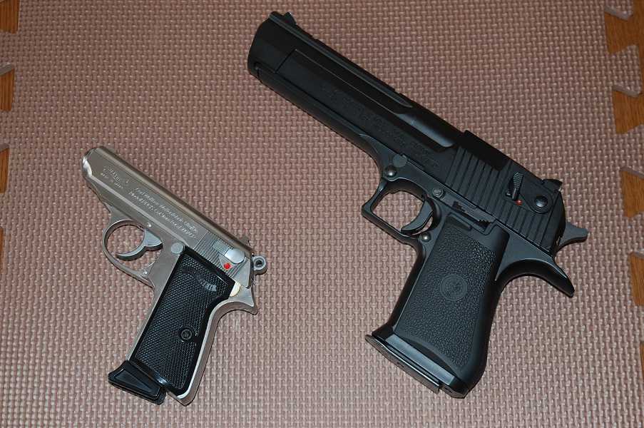 山ランの際に近所の低山で猪と遭遇する事が多くBB弾のPPK(写真左)を護身用に持参してた事がありますが両ストックで防御した方が良さそうです。最近は熊出没が多くなり写真右側のデザートイーグルの方が良いかと思いましたが熊が出そうな山は避ける方が賢明のようです。ブローバックの音が山で反射するので鈴より警告するには良いです。