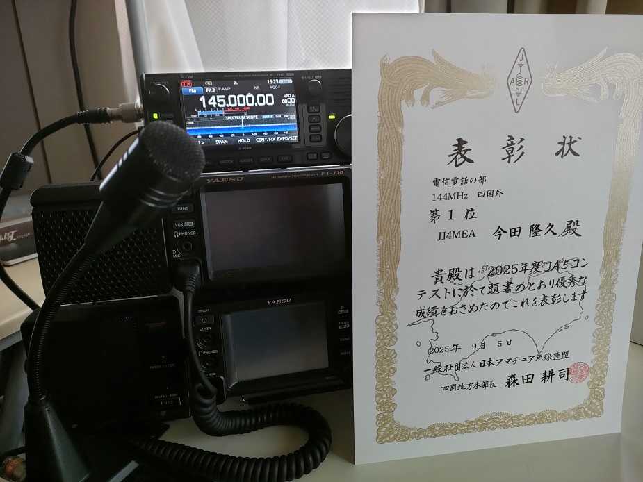 毎年自宅から10W運用で5エリア局と交信コンテストです。IC-705と2.5mGPですが参加局が少なく穴場部門です。コンテストは敢えて10W出力ですが今年に入り4枚目の賞状でした。