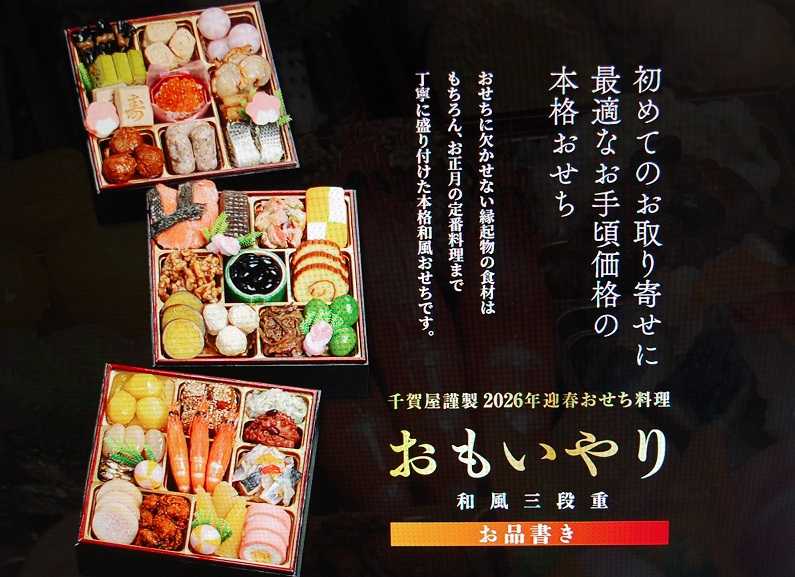 毎年この時期はおせち料理を予約注文してます。今回は楽天市場で12/31着で依頼しました。溜まってた楽天ポイントを一部使用し実質8,000円でした。昔は年賀状に1万円位掛かってましたが数年前からSNSでの挨拶に変えてその浮いた分でおせちを注文してます。以前のように注文してたお店に取りに行く必要もありません。素材は中国産は一切使用してないとの事で人気のあるおせちで早めに注文しないと売り切れ材料の高騰から値上げされるので早めの注文はお勧めです。後は年末に年越しそばとお餅を買えば正月の準備完了です。