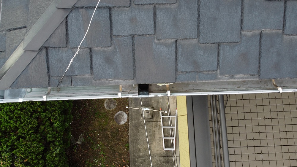 2階屋根材の先端に苔が付着してるので樋に溜まってるかを調査