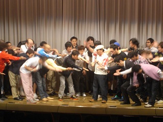 会場入りしての第一印象…「ミャサ男の学校と比べて、参加者が少ないかも?」 決して多けりゃイイというモノではないが、少ないのは淋しいな。。口出しする前に、まずは顔出ししないと文句も言えまい。 お決まりの「後席モンモン、前席ガラガラ」状態のため、遠慮なく思い切り前方に陣取る。しかし少し後ろの一人の父母が、ズーーーーッとお喋りしていて聞き苦しかったのは残念。 総会に続けて学校から経営計画と近況報告。今年(2013.3)の卒業生はかなり頑張ってくれたと、進路課先生はニコニコ顔で説明している。国公立大の合格数が、ここ数年と比較して1.7倍に上がったモンね! ある父母が「昨年赴任した校長先生の方針が影響している!」と呟いているのが聞こえた。「西部の超進学校から来た校長はイイ、ウチの息子もあやかりたい!」と目がキラキラしていた。------------------------------ 体育館から教室へ移動して学級懇談会。出席者は13名と、やはりミャサ男時の半分って感じ。ん~残念。。 担任先生からのお話に続けて、3組に分かれてグループ討議。自己紹介とフリーな発言。ウチの組は「ケータイ・オープンスクール・研修旅行」等についてナカナカ活発なトーク。 「それでは代表者を決めて発表してください」という担任の提案が終わらない内に、まるで台本通りか?と思えるくらいに、4人のお母様方が揃ってオイラへ「どうぞどうぞどうぞ!」と譲る手の平を向けてきた。 思わずオイラは「ダチョウ倶楽部の上島竜兵か?」と突っ込みたくなったゾ!? まさにこんな感じぃ~(笑)