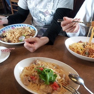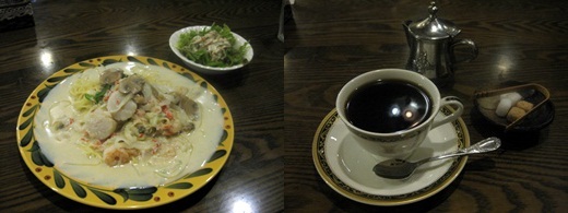 明日は人間ドック。今晩は21時までに夕食を済ませろと・・・だがこの雨天で娘から「スイミングへ迎えに来て!」とヘルプが掛かる。仕事を終えて向かうと、帰宅は21時を過ぎる。。途中島田辺りでラーメンでも食したいが、サッパリ系の「燕」は開いている筈も無く、他の「よかたい」や「大喜」は脂肪っぽいから好ましく無いしぃw (TT)仕方が無いから只今話題満載?の、丸亀で素うどんでもすすろうかしん??(・・;)…などとFBで呟いていたら、知人から「ポプリでパスタなど如何?」とコメントされた。んじゃ、折角だからと島田の「ポプリ」に行っちゃいました♡オーダーは「ポプリ風帆立パスタ」。カニ身に加えエビ・イカ・アサリがゴロゴロ入っていて、マッシュルームや玉ネギ・ピーマンもイイ感じで絡んでおロの中に!食後はマンデリンをお願いして、突然の贅沢な“人間ドック直前ディナ一“を楽しんじゃった。(^-^;