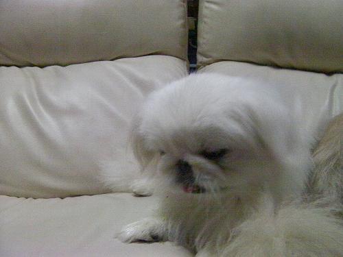 白いクッションで白いヨータンが半目で寝そうになってます(笑) 白 白同士だから分かりづらい(´A`) おててが丸くなっててかわいい(*^_^*) 親バカですいませんm(_ _)m