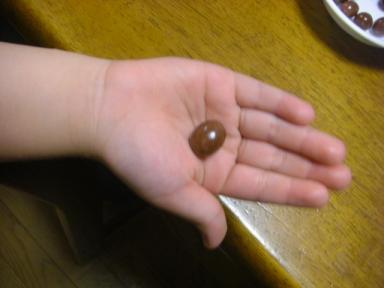 9月の無料出品も終わりました。10月も一回しかないのかしら、無料出品?一泊二日じゃなく 二泊三日ぐらいすればいいのに。以前は二泊三日(最終日は一時まで)ってのもあったよね。予定のたてづらいヤフオクです・・・・。明日からしばらく、写真貼りにいそしみますわ。ところで 昨日は幼稚園の参観日でした。(ご好評いただいた第197回 アユキチを探せ!(ちょっと回数、サバよんでます)この時間を持ちまして、無事終了とさせていただきます。次回 第203回 アユキチを探せ!をお楽しみに^^。)この時期の参観日は必ず運動会のダンスの練習。秋雨前線と台風の影響で 雨交じりの天気。蒸し暑いホールで踊ってきました、忍たま乱太郎。子供がぶら下がる振り付けこそないものの、最後のキメは子供を抱き上げる。絶対無理ですからぁ!残念!!でもいい汗かいて いい運動でしたわ。参観日終わって帰っていると、お友達のママからもらいました。大きさは結構デカイ!息子といっしょに食べました^^。今日は雨の中、ケンキチの遠足。龍河洞へ行ったらしい。感想・・・聞いてないです。おやつ買って、お弁当作っただけかな?5時20分起き・・・。昨夜12時過ぎまで頑張って・・・今朝5時20分おき。今から布団に飛び込んできます。番外奈良のお土産 鹿のフン 第2段中身はこれ結構食感よくって 気づけば一人で完食。こんなんで15日の検診は大丈夫なのか?いや、ダメ!メタボ検診 ひっかかること必至。今から少しでもダイエットしますわ~。