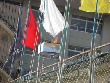 日曜日、雷雨順延となった 体育祭の午後の部、今日大々的に催されました~。あれだけまいてまいてまいてまいて、午後の部の4番までを 12時前に終了していたのに・・・。うってかわって のんびりした運びとなりました。9時に開始して、2番目の競技が終わった時、既に9時半(そうそう、開始直後にラジオ体操があったわ)。暇なのであちこち見てると聖火いつもは色分け3組なのに、今年は5組で、ようやく「オリンピックかぁ」先生の意図に気づきました・・・遅すぎ(≧▽≦) で、毎年お楽しみの部活対抗リレー剣道部とサッカー部何部だろう。卓球?ハンドボール?前は科学部、後は水泳部だね毎度おなじみ 柔道部。昨年は全員が畳担いだんで2周遅れだった。今年はアンカーの子だけが 畳を担いで走りました。例年通り ゴールしたあと 本部席前で 投げ技披露してました(≧▽≦) 応援合戦は、ケンキチ 頑張ってました。傑作な踊りを披露して 笑いをとってました。アップしたかったけど、今月の分は残り少ないので、来月、合間を見てアップしましょう!乞うご期待!