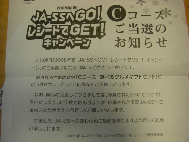 今日もいつものガソリンスタンドで みみっちく 給油しました。今日は172円/リットルでした。下がったとはいえ、まだまだ高いよね~。その分サービスしてくれるのかしら。あたりました~~~~。Aコース 一万円分の選べるギフトではなく Cコースだったけど、大目に見ましょう!!(≧▽≦) 我が家は頼みました^^。ターリンが 「配達希望日は土曜にしよう。オレが帰って来てるから」はいはい(≧▽≦) 皆でいただきましょう!やっぱ、ガソリンはいつものところで 入れないとね(≧▽≦)