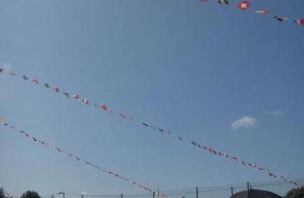 秋晴れ・・というより、夏が来たかと思うほど、いい天気でした。兄たちの運動会が雨で流れたのとは大違い。やはり 普段の行いでしょうか?今日、アユキチはノラネコにミルクやってました。私のお気に入りのコレールのお皿を道路に置き、ノラネコになめさせてました・・・。私の好きだったお皿・・・。鉢植えの皿に格下げになりました・・・。どうせだったら、100均で買った皿でネコにミルクやってほしかった・・・。というわけで、行いのいいアユキチの運動会です。期待の綱引き一勝一敗の引き分けでした。徒競走は4人中3位、リレーは4番手で走って・・・・重量級の走りを見せてくれました^^;動画、今月は既にアップできないほど使ってるんで、来月持越しでアップしますわ、ダンスのみ。重量級の走りは・・・また小学校で見せてもらおう!園内の旗園児の手作りです。年長さんは国旗の絵本を見て 作ったそうな。アユキチ作どれだかわかる?「アユちゃんの国旗、赤いね~」「あれは 茶色!」母の目には どう見ても赤に一本線ですが・・・。ちなみにどこの国旗ざんしょ?オリンピックでも見かけないような・・・。そうそう、先日GSの懸賞で当たったブツ、届きました。明日の晩ご飯はメンチカツ定食、何枚上げればいいものやら・・・・。