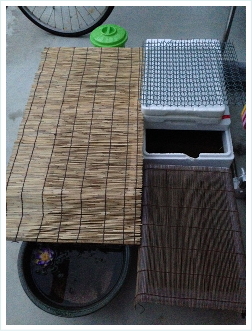 日本列島に強い寒気がやってくるそうなので、めだかたちの水槽に屋根を被せました。四国じゃまだまだ氷が張るどころか霜も降りないだろうけど、水温が下がらず少しでも温かいまま保てれば…とちょっと親心。でも発砲容器の蓋って真っ暗になって光まで遮ってしまうんですよね。で、成魚の方は1/3ほど開けたままでちびっこの方はとりあえずスダレを追って屋根代わり。今度のお休みは蓋に天窓を作ってみようかなと思案中です。