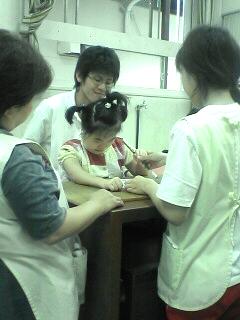 最近のももの訓練の様子です。もものOTの先生は新人の訓練士の先生です。水曜日のOTの時間は訓練部長の先生も来られて よりよい訓練指導がなされているかを確認、フォローして下さいます。いつも優しく温かく実に細かく様子を見て下さるので私も学ぶことが実に多いです。写真のももの後ろは実習生の先生です。手前が訓練部長 そしてOTの先生。まんなかがももです。実習生の先生にあとで「割り算の教え方を教えて欲しい」とお願いしていました。やり方ではなくてみんなで教え方を教えてもらうのは難しいねえ~となんだか面白い会話が、、笑 。★。・゜゜・。☆。・゜゜・。★。・゜゜・。☆。・゜゜・。★術後しばらくしてOTの訓練の先生が変わりました。手術の日に担当看護婦さんも大好きだった看護婦さんもお辞めになり なんとOTの先生まで術後編成のため変わってしまうということでショックを受けていたぱんだ家でしたが、、、新しいOTの先生は新人の先生で正直最初は心配していました。(ごめんなさい、、先生)とても意欲的でしっかりしている上に謙虚な先生でまた子どもの心をよくつかむのがお上手で真剣に訓練に取り組まれています。ももちゃんは小さな声で「先生かわいいから好き」と母に教えてくれました 笑実際先生は山口もえちゃんに似ていて本当に可愛いです。女性が自立できる職業として高校時代から専門職のOTを目指していらしたとか。先生は看護婦にもなりたかった時期があったそうでその話を聞きながらももは 「もしなったら絶対病棟でも ももちゃん担当になってね」と言っていました。ならない、ならない~~ 笑この意味不明な会話が可愛かったです。今日の課題は絵の具を使っての迷路でした。迷路が大好きで もっともっとやりたい!と楽しそうで意欲的でした♪先生が用意していた課題をやり終えてしまったのでOTの先生が即効で作って下さったのがこれ♪「どんな迷路がいい?ももちゃん」会話の中で ももが「介護福祉士のNさんがすきなの」と若いお兄ちゃんの話になりました 笑(あ~~また変わってる 笑 と母は思った。 ももには好きなお姉さんやお兄さんがいっぱいいる)では指令を与えます!N君のハートをゲットせよ♪^^」きゃっきゃ言いながら 筆をもって迷路をたどります。「人生山あり谷ありだ!進め~~!! ぶつかっても乗り越えるのだ~♪」「ハートをゲットできるまではあきらめないのだ~~!」と先生盛り上げてくれてそれは楽しい訓練時間でした。 見ていてもそれは楽しそうでした。私も面白かったです。先生ありがとう、、、