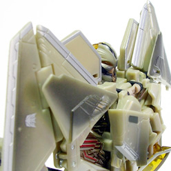 スリットから覗く機械パネルが合わせ絵のように組み合わさる工夫も、残った翼後部をパタパタと折り紙のように処理するアイディアも面白く、トランスフォームを繰り返すことがクセになるギミックが満載です。