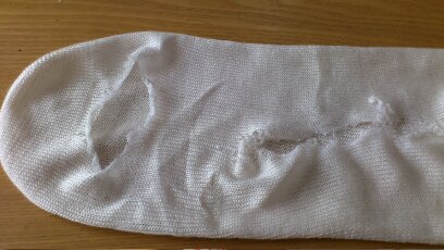 8月の終わりから冷えとりをはじめて、2か月が経過しました。今朝、靴下を履きなおそうとしてみると、右足の3枚目5枚目の絹先丸に、でっかい穴 6cm大が ぽーーーんと開いてました。かかとと、指の付け根の2か所です。(画像掲載)溶けて開く、といううわさどおり、繕おうにも、穴は円形にすぽっと抜けてしまい糸の継ぎ目が合いません。つぎを当てないといけない状態、と言えば伝わりますでしょうか?私の靴下は、宿り木の会のはくひ絹と、841(楽天)さんの奈良県広綾町の靴下をミックスしているのですが、たまたま841さんところのものに穴が開いていました。1枚1200円。決して安くは無いけど、靴下が毒を受けてくれたと思うと、感謝したくなります。冷えとりしてから、風邪引かない記録更新中です。いつも体力が無く予定が、入れられなかったのに、毎日友達とおしゃべりしたり、散歩したり生活が満喫できるようになってきました。冷えとりにすっかりはまってしまいます。 冷えとり健康法の3,5,7枚目に。重ね履き用絹100%先丸靴下。【奈良県広陵町】絹先丸ソックス