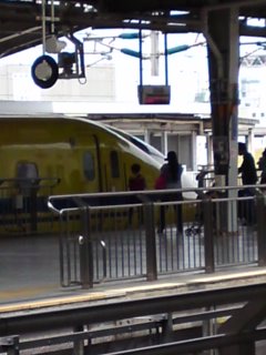 新大阪のホームに黄色の新幹線が停まってました。鉄ちゃんが群がってました。