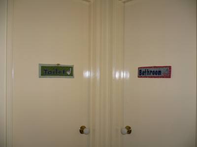 トイレのドアサインを作ってみたもののあまりのガタガタぶりに嫌気が差した私。やっぱり私が一人で作るなんて無理があるんだわ・・・・・と、へこんでいたのですが、トイレに行った人が手を洗うために、間違えてリネンのドアを開けると、そこはグチャグチャに物が詰まった世にも恐ろしい場所・・・・・なので、どうしてももう1つ、バスルームのドアサインを作らなければいけないな~と思いました。こちらのトイレ、トイレの室内に、手を洗う場所が無い事が多いんです。我が家もそう。メインベッドルームの横のオンスイートのトイレには、すぐ横に手洗いがありますが、お客さんや子ども達が使うトイレには、手洗いがありません。そのため、トイレを出たら、バスルームのドアを開け、洗面所で手を洗ってもらわなければいけないのです。めんどくさいですよね~~~。いつかコミュニティーセンターで「日本のトイレは、タンクの上に、 手を洗うための水が出て、それがタンクの中に入り、 次の流すための水になる。」と言う話をしたら、「それは良い考えね~~~!」と感心されましたが、こちらではそういう類のものは見かけたことがありません。あったら便利なのに・・・・・結局、物置と化しているリネンを開けられるのは困るのでバスルームのサインを作りました。前回の失敗を生かして、ミシンの下糸もちゃんと同じ色にし、裏は厚紙に布を貼り付けずに布ではさんだだけにしました。前回よりは、縫いにくい!もう止めたい!と思う事は無かったものの、やっぱり出来上がったものはガタガタでした。こんな感じになりました。よく見ると、シャワーから水が出ているの分かります???でも、私、やっぱり不器用ですわ~~~~。ま、とりあえず、場所が分かるってことで、良しとしましょう。いつも応援ありがとうございます。ポチッとクリック、励みになります。