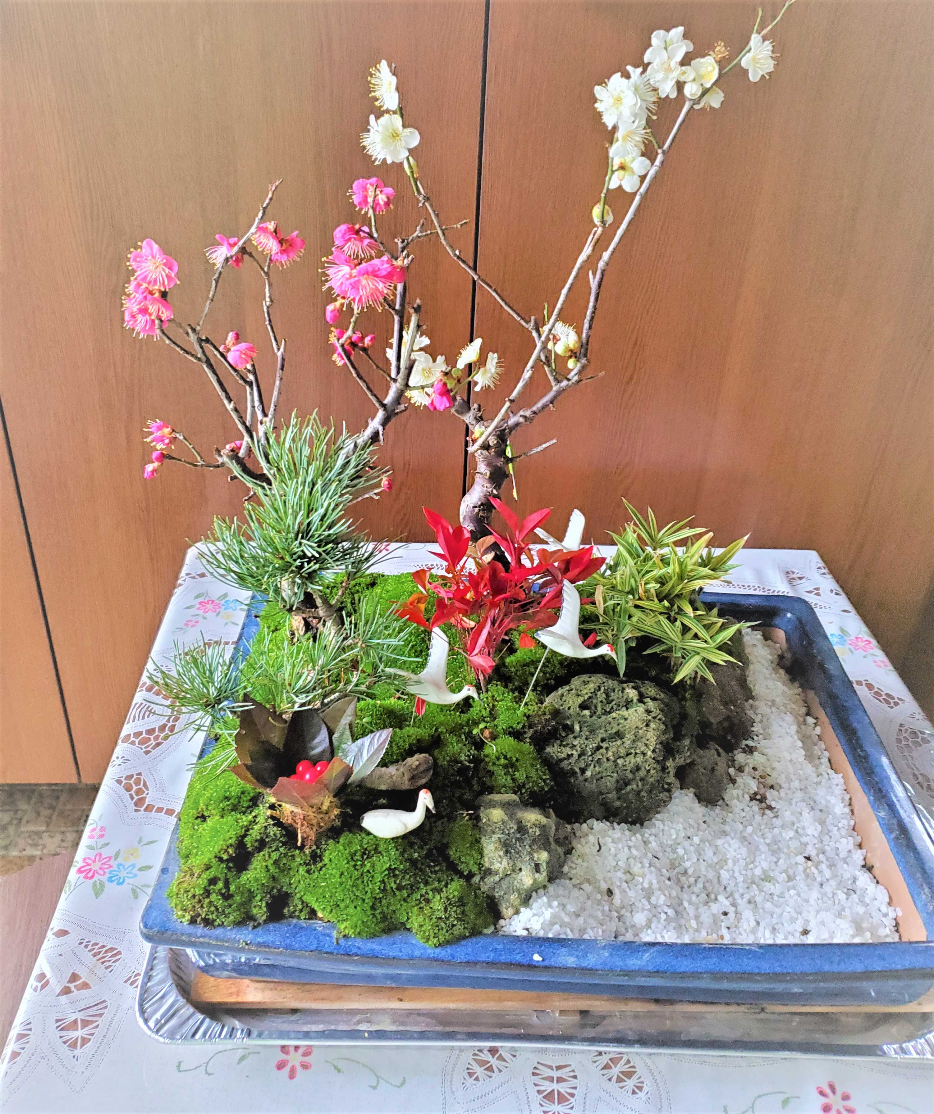 玄関に置いてある正月用の寄せ植えの梅が満開になっていた。