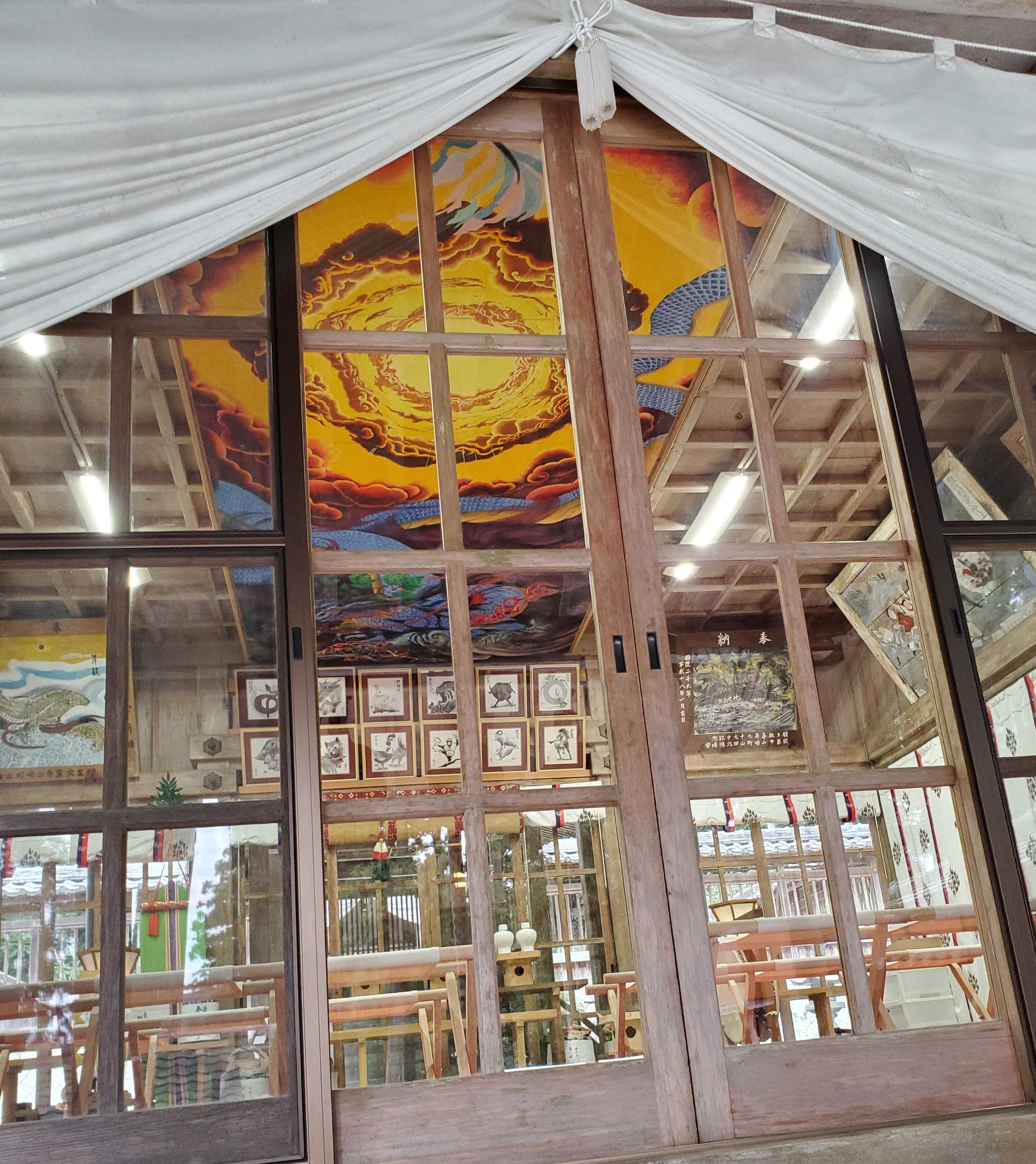 安志加茂神社の拝殿で、地元の人に教えられたように天井に絵が描いてある。扉が閉められていてあけることができなかった。みたところ現代的な作風で最近の作かと思われる。