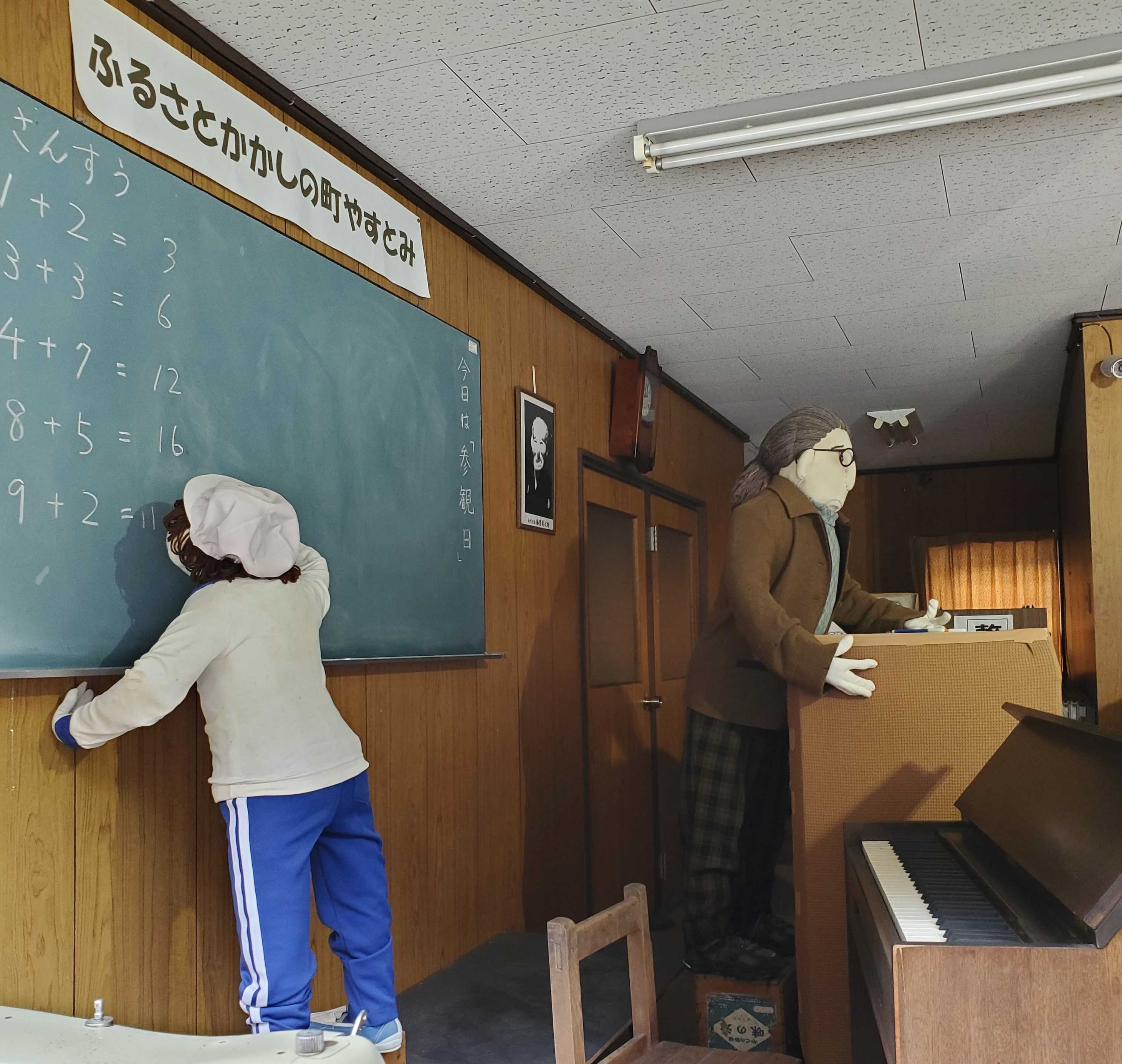 自転車を押している人、リヤカー引っ張っている人などいろいろな案山子が点在している。