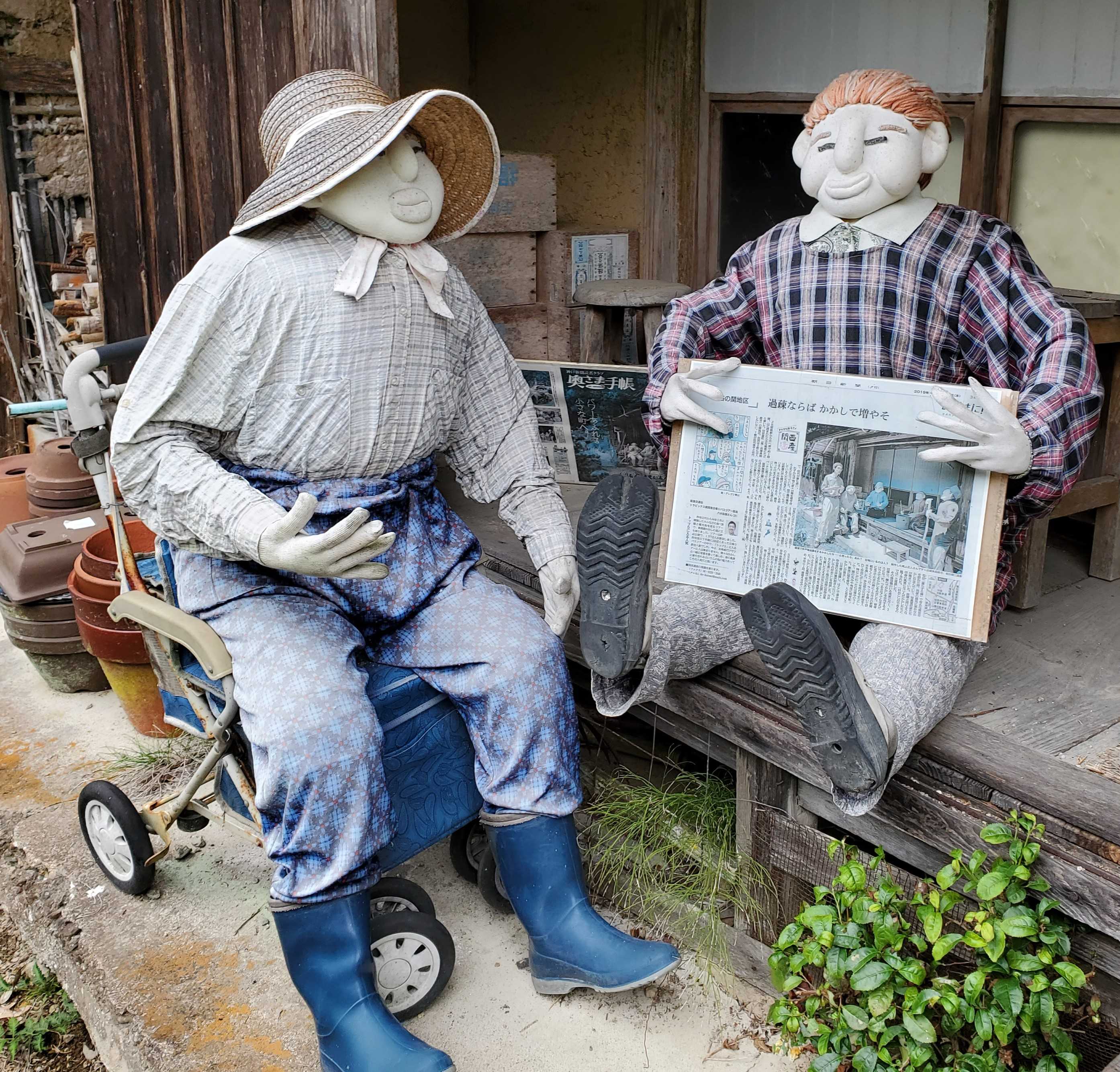 安富町関地区にある奥播磨かかしの里は過疎化や高齢化が進んだ集落の村おこしとして、約130体の案山子たちが集落内の様様な場所にたたずみ、昔の暮らしを再現している。
