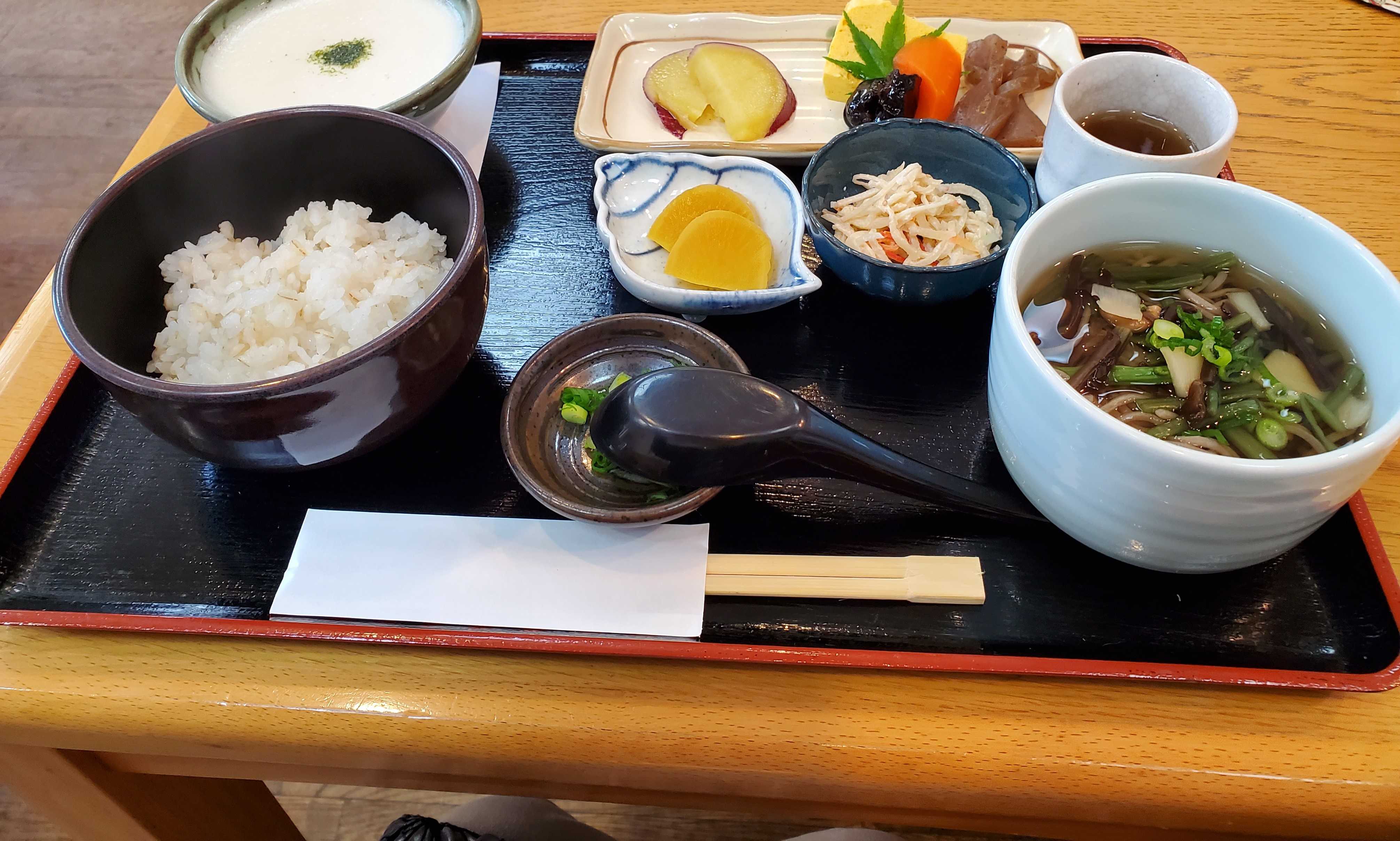 麦とろ御膳、奥にたっぶりのとろろ汁。煮しめ、つけもの、出汁まき卵、サツマイモなど