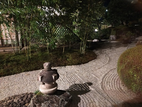 ライトアップされたキレイな枯山水の庭園が