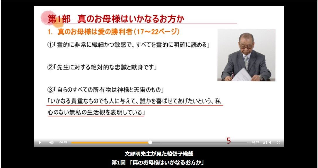 文鮮明先生が見た韓鶴子総裁小山田先生が「 韓鶴子総裁御言選集(4巻セット) 」の 第4巻『文鮮明先生が見た韓鶴子総裁』からお父様のみ言を項目ごとに要約した内容 となっていた。