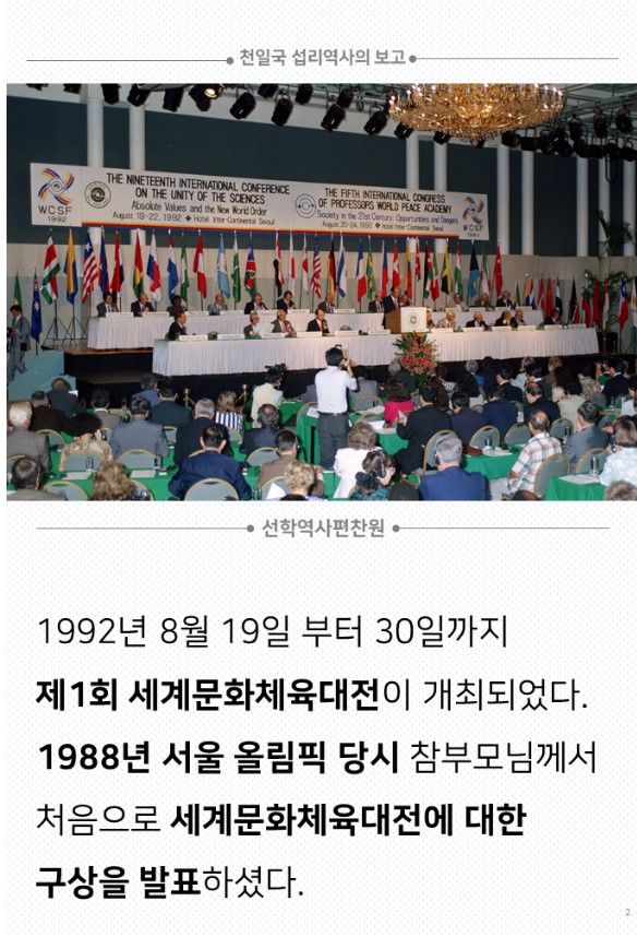 真の父母様は、ソウルオリンピック大会の期間である一九八八年九月二十七日、百二 十ヵ国の代表が参加する中、ソウルの漢南国際研修院で、神様を中心とした心情文化世界を目指す「世界文化体育大典(WCSF)」の開催を提唱された。「世 界文化体育大典」は、人間がつくった障壁を崩し、超国家、超人種、超宗教的に和合一体を目指す文化祝典である。このような背景のもと、一九九二年八月十九 日から三十日まで、ソウルで第一回「世界文化体育大典」が開催された。