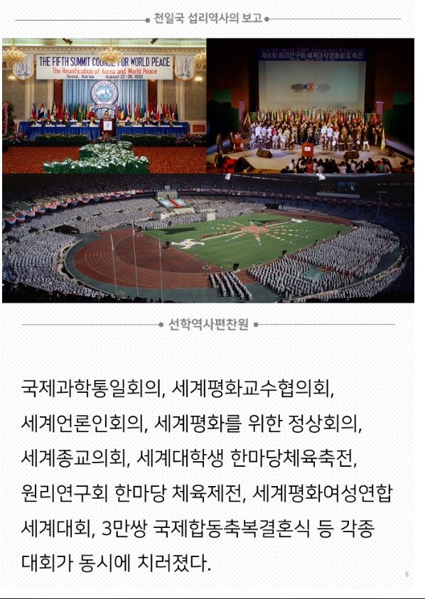 10 第一回「世界文化体育大典」は、早くに天命を受けて復帰歴史の流れを看破してきた私が、生涯を通して主導してきた各分野の集まりをすべて網羅し、唯一の神様を中心とした一つの絶対価値基準を基盤として集まる最初の大典です。五大洋六大州において、多様な文化圏に四分五裂していた伝統、文化、価値観などが、 様々な特色を生かしながら、全体的な調和を通して新しい統一文化を創造していくのです。