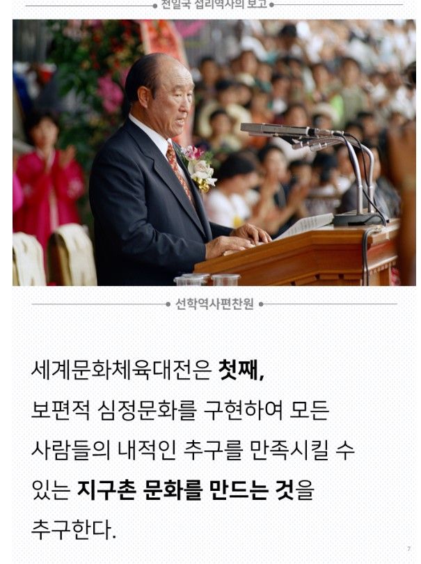 7 新しい時代が開門するこの時点において、八八ソウルオリンピック大会の大勝利とともに、「世界文化体育大典」の開催を宣布しました。それにより、お父様が広げておいた様々な問題(提起の場)を初めて一ヵ所に束ね、世界が新たに回っていける一つの中心軸をつくるのです。ここにすべてのものが巻き込まれていけば、世界が、サタン世界ではなく、天の世界に変わるようになるというのです。ですから、一つの世界に向かう促進剤として活用するのが「世界文化体育大典」 です。