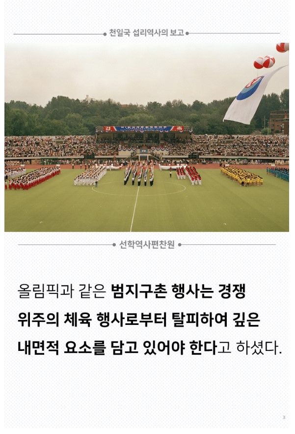 ですから、ここに精神的内容を結びつけなければなりません。そのような意味で、このオリンピック大会のような「世界文化体育大典」を中心として一つになるのです。