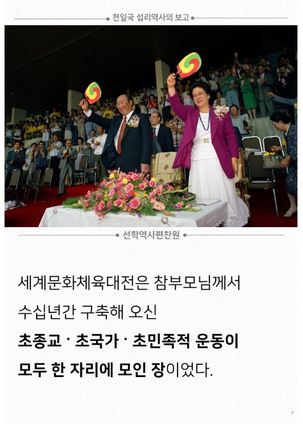 11 「世界文化体育大典」は、全世界の学者、宗教指導者、言論人、政治家、青年指導者、体育人などが、神様を中心とした地球村家族の一員として出会う祝典で す。神様を根源とした人類和合の知恵と経験を結集し、平和理想世界を目指す天宙史的な行事です。本然の理想世界は、神様の真の愛と、真の生命、真の血統を 中心として、アダムとエバが真の子女、真の兄弟、真の夫婦、真の父母の心情圏を完成することによって形成される世界です。