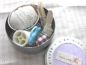 我家にはたくさんのお裁縫箱があります。結婚式の引き出物で頂いた木の箱の物昨年自分へのお誕生日プレゼントとして買ったラタン製の物。でも一番愛用しているのがこのソーイングボックスです。 これは以前紅茶が入っていた缶なんです。蓋のラベルをはがしてお気に入りの布を張って「home work」とスタンプを押しています。この中には、お友達のハンドメイドショップで買ったピンクッション糸切りバサミ、手縫い用糸、針、ハギレのレースなどソーイングに欠かせない最小限の物が入っています。いつもダイニングテーブルに置いてあってボタン付けをしたり、まつり縫いをしたりミシンを使うとき蓋は糸くず置き場になっています。この紅茶の缶はとても便利でこのサイズより小さい物はボタンを入れたり、ミシン針専用に使っています。「小さなソーイングボックス」私のソーイング生活に欠かせない大切な相棒です。