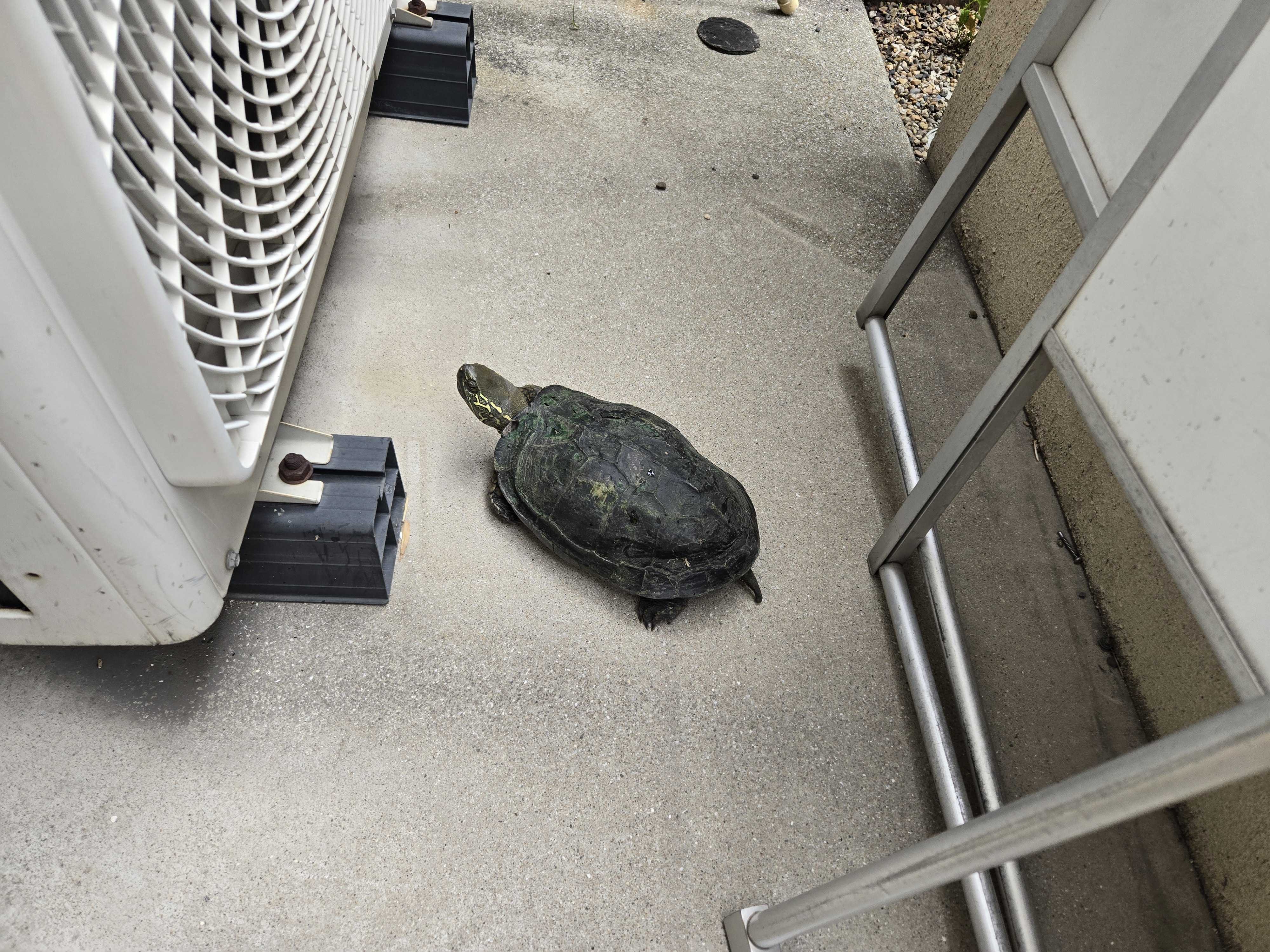 朝 玄関の横に 大きな亀が居てどこから来たんだ。うちも 水カメを飼っているけど大きさが4倍くらい。うーん これは悩む🌀