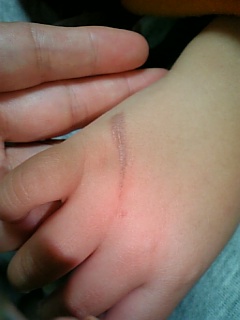 昨日の火傷は、やはり、冷やしたお陰か、少々の水ぶくれでおさまった。確かずっと前にゴン太がアトピー様の皮膚炎ができた時にもらったボチシートが残ってたはず…。と、薬箱にあった薬袋を思い出す。ボチシートは火傷に効くはず。と、ネットで再度確認し。ボチシートを5×30ミリにカットし、水ぶくれの上に貼り、その上から大きなバンソウコウで押さえた。寝てる間に、多少直ってくれないかな。と期待しつつ。今朝起きてバンソウコウを外してみると、なんときれいに水が乾いており。傷がまるで「びっくりマーク」!!!。そう言って笑うと、ゴン太は相当気に入ったらしく「びっくりマーク!」と言っては、皆に見せ回っていた。カサブタになって、それが剥がれてしまっても、この傷は、消えそうに無いですなぁ…。