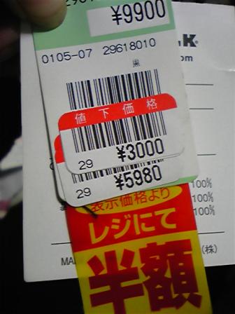 2年ほど前のシーズンオフに買ったものだと思うのだが、結構しっかり目のコートが出てきた。大きなサイズのものはなかなかないので、見つけたときに「ラッキ♪♪」と思って買ったものの、次のシーズンまで仕舞ったまま、そのまま忘れる、というパターンである。仕事場のクローゼットの奥から旦那が見つけ出したら、見事に値札が付いたまま。それがこれ。。。↓↓↓ 定価9900円 ↓ 7980円 ↓ 5980円 ↓ 4980円 ↓ 3000円 ↓ 半額 というわけで。。。1,500円で買った、ってことですわ。。。え???売れてない、ってことは、人気がないってことぉ?ちがう!サイズがね、大きすぎるのよ。私に買って欲しかったのよ!!今年は、着れそうだな。ふふふ。
