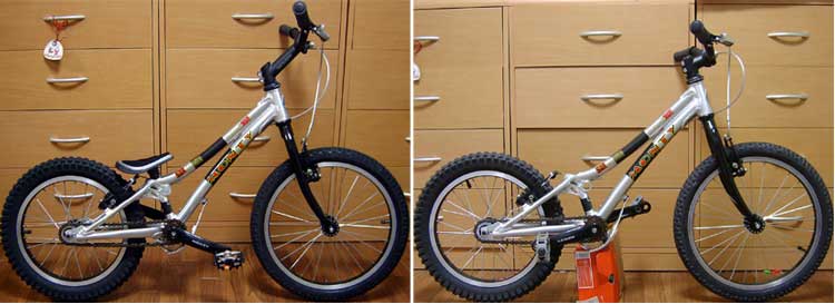 1月末に予約してあったhitoのニューマシン (MONTY 205PR RB) が、 昨晩、やっと来ました~前輪18、後輪16インチの太いタイヤ ペダルの所にフリーハブとアンダーガード 最初はニコニコ このペダルがスネを直撃、痛いよな~セッティングの為に自転車を部屋の中へ入れたので、ついでにhitoを乗せてみたら、いきなりペダルから足を踏み外し、ペダルのギザギザ部分でスネを強打!あまりに大泣きするので良く見てみると、、、 スネに2ヶ所の傷があり、1箇所はズル剥け~トライアルの練習をするときは、スネ当て、膝当てを付けるのだけど、ペダルに立つだけなら大丈夫かと、半ズボンで乗せたお父さんが悪かった。 ゴメンな。。。イソジン軟膏を塗って絆創膏を貼り、hitoが落ち着いた後で、早速、ペダルを安全なプラスティック製に交換しました。(気付くのが遅いよな~)屋外で乗る前に、トライアル自転車の痛い洗礼を受けたhitoであった。(涙、、、)::::::::::::::::::::::::::::::::::::::::::::::::::::::::::::::::::::::::::::::::::::::::::::::::::::::::::::::::::::::::::::::::::::::::::::::::::::::::::::::::::::::::::::::::::::::::::今日は新しい自転車の練習、、、クランク(フレームとペダルの間の黒い棒)が長過ぎる(大人と同じサイズだもんな~)のとギア比が軽すぎて、自分でスタート出来ないし、押してスタートさせても、大股で漕ぐことになるので長く続きしない。雪が舞って寒かったこともあり、練習は30分程で切り上げた。いや~ こんな状態になるとは思ってもみなかったので対策を検討中!それから、【ウィステリア鉄道】へ電車で行く事にして、まずは暁学園駅まで車で移動した。暁学園駅で切符を買おうとすると、本日は雪の為には運休との張り紙が、、、仕方なく、暁学園駅にある【鉄道おもちゃ屋】で4時間半も遊んで来た。いろんな子と一緒に遊ぶことができて、hitoは楽しく過ごせたようです。 さて明日は泣かずに登園できるか? ◆帰宅途中に自転車屋へ寄ったけど、短いクランクは販売されていないとのことなので今のクランクを短く切って、穴を開ける以外に方法がないみたい、、、6061という堅いアルミに正確に穴を開け、ペダル用のネジ山を切るなんて素人には無理だよな~誰か助けて~!