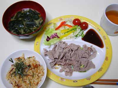 夕食の写真はあった~牛肉の冷シャブ、野菜サラダ、うなぎのひつまぶし、味噌汁この日は暑かったんだろうな~ (ボケボケです)